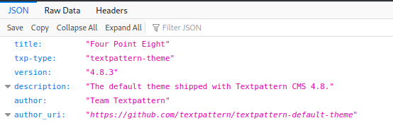 It looks like there may be some exposure of the various directories that contain the innards of this CRM. In order to fingerprint the CMS version to start looking for vulnerabilities to exploit, I browsed to the /textpattern/textpattern/setup/themes/four-point-eight/manifest.json url, where the site’s theme files notes the site version.