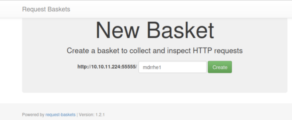 Visiting port 55555 at /web shows the following application, noting the banner “Powered by request-baskets | Version: 1.2.1” at the bottom of the page. I did some digging around with this and found some vulnerabilities, one example of which is CVE-2023-27163, or SSRF via the component /api/baskets/{name}.